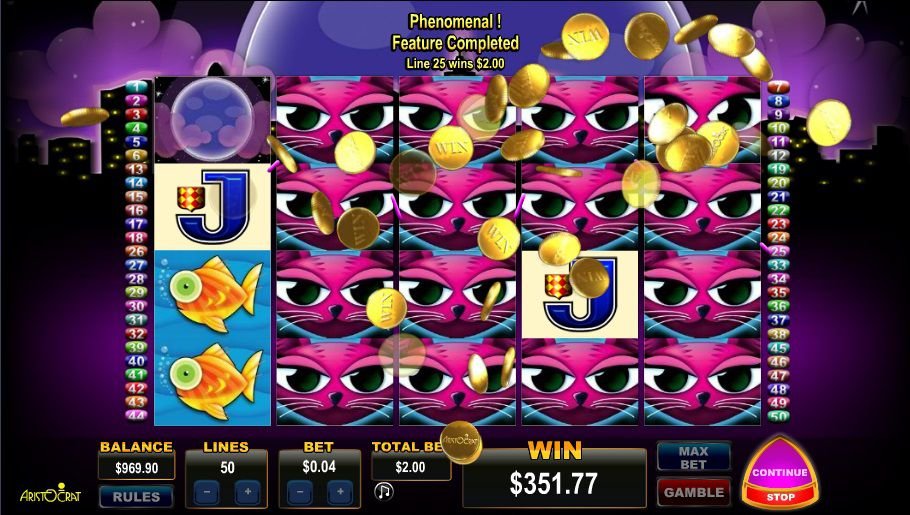Miss Kitty; sevimli teması, harika grafikleri ve bazı eğlenceli özellikleriyle en sevilen popüler Aristocrat slot oyunları listemizin 1.sırasında yer alıyor. 50 ödeme çizgisine sahip 4 sıralı, 5 makaralı bir yapıya sahip Miss Kitty slot oyunu, makaralara yapışkan wild’lar ekleyen ücretsiz döndürme bonusu özelliğiyle hem eğlendiriyor hem kazandırıyor. Masaüstünüzde, tabletinizde ve mobil cihazınızda kolaylıkla oynayabileceğiniz Miss Kitty slot oyununu gerçek para yatırarak güvenilir casino siteleri üzerinden 7 gün 24 saat dilediğiniz noktadan erişim sağlamak mümkün.