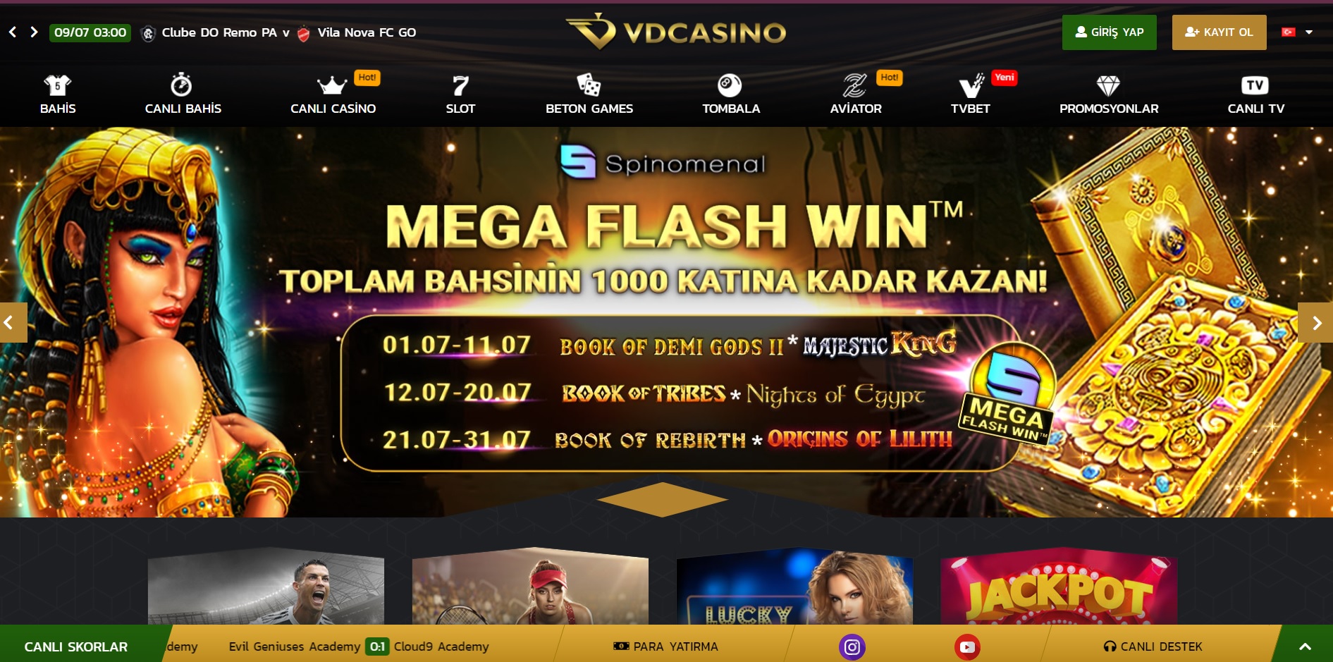 Casino tutkunları için “Canlı Casino ve Slot” oyunları sunan site, aynı zamanda bahis severler için “Canlı Bahis ve Bahis” kategorilerinde birbirinden farklı maçlarda yüksek oranlar sunuyor.